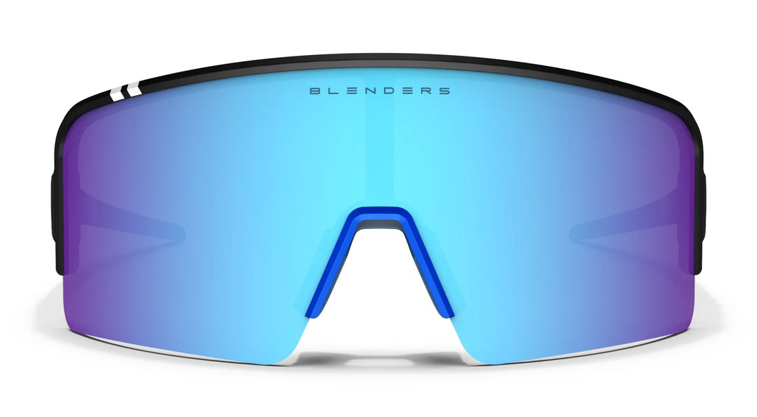 Need a look that’s at home from the beach to the blacktop and everywhere in-between? ‘Breaker Point’ is where it’s at. Part of our ‘Eclipse X2’ collection, it’s a lighter weight option that won’t hold you down, yet still sports our polarized wraparound design for complete protection. Style surges high, too, with a black front frame contrasted by an icy blue lens. At the sides, ebony temples flow into a crystal clear shade before breaking into solid blue ear tips. It’s finished off by contrasting white Blenders stripes at both the top and temples—the perfect reminder to keep Living Forward. //