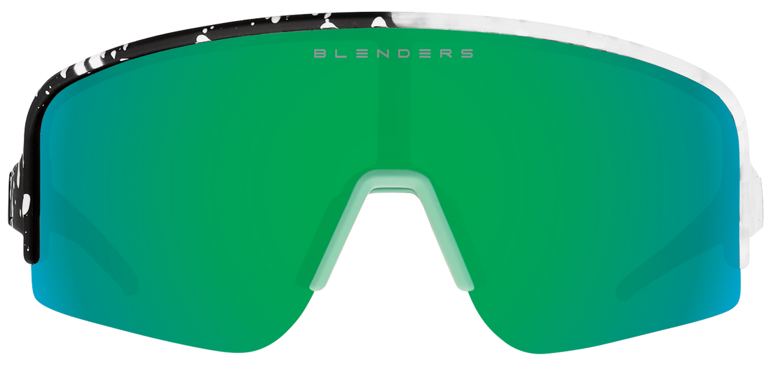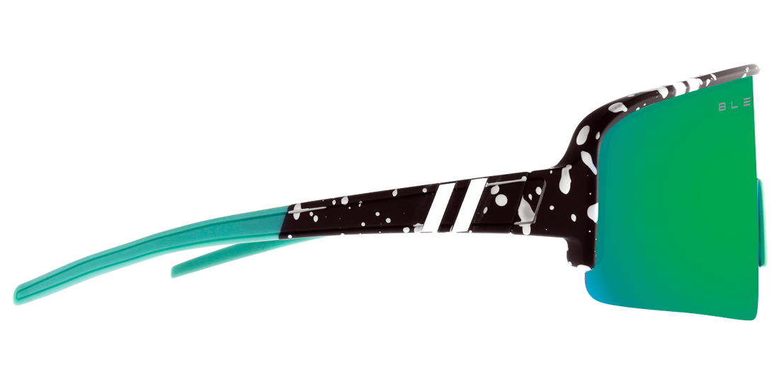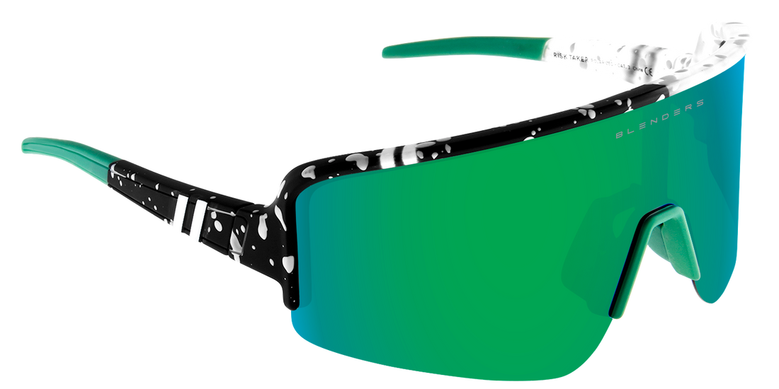 If ever a pair of shades was deserving of its name, it’s 'Risk Taker.' Caution is cast to the wind here—these single lens sunglasses are full speed ahead. The incredible wraparound TR90 construction is lightweight and comfortable thanks to a semi-rimless design that makes getting in motion easier than ever. The polarized wraparound lens boasts a vivid burst of green color that’s complemented by teal temple tips. And the frame triumphs with a steezy paint splatter effect scattered across a half-black, half-crystal-clear colorway. This is one risk you just gotta take! //
