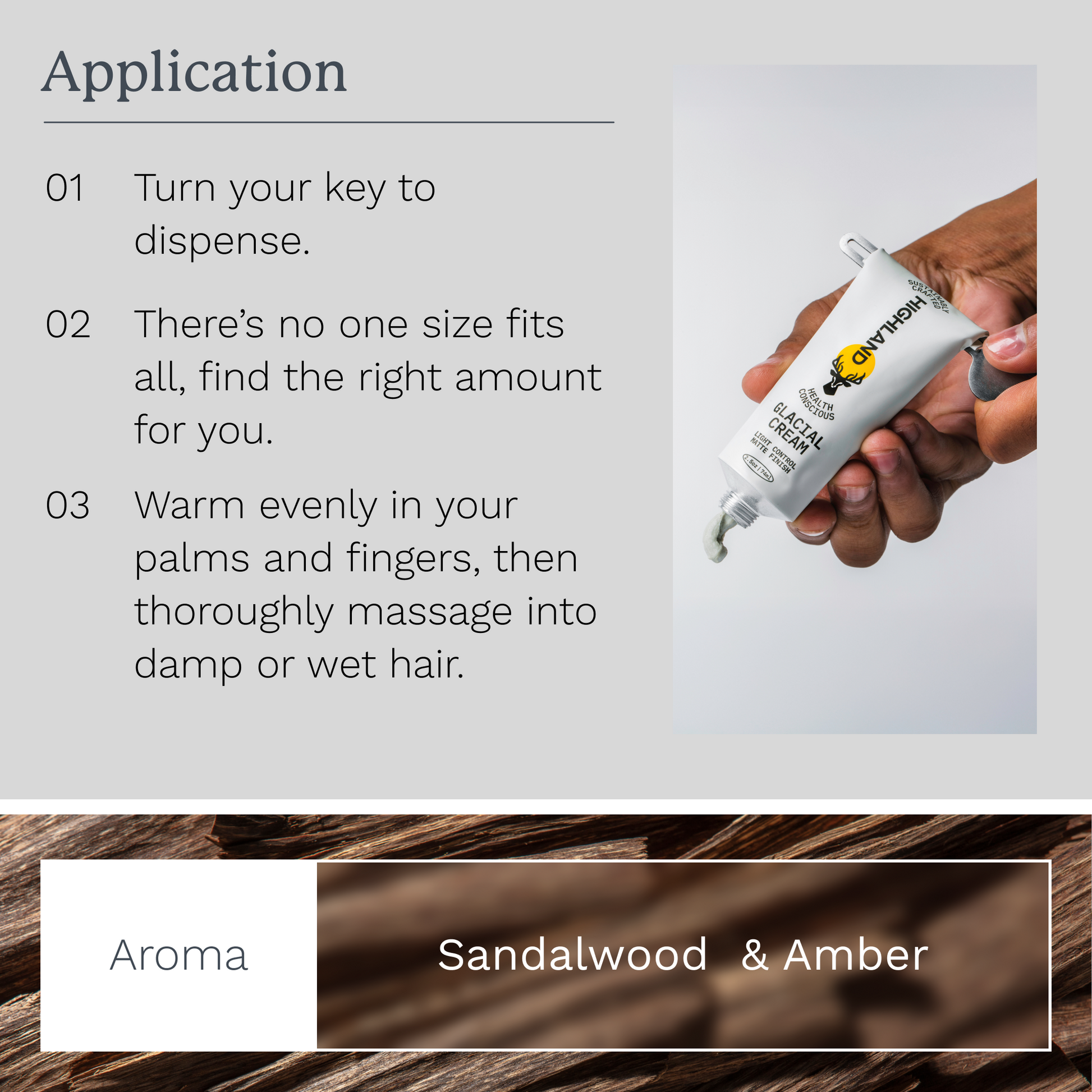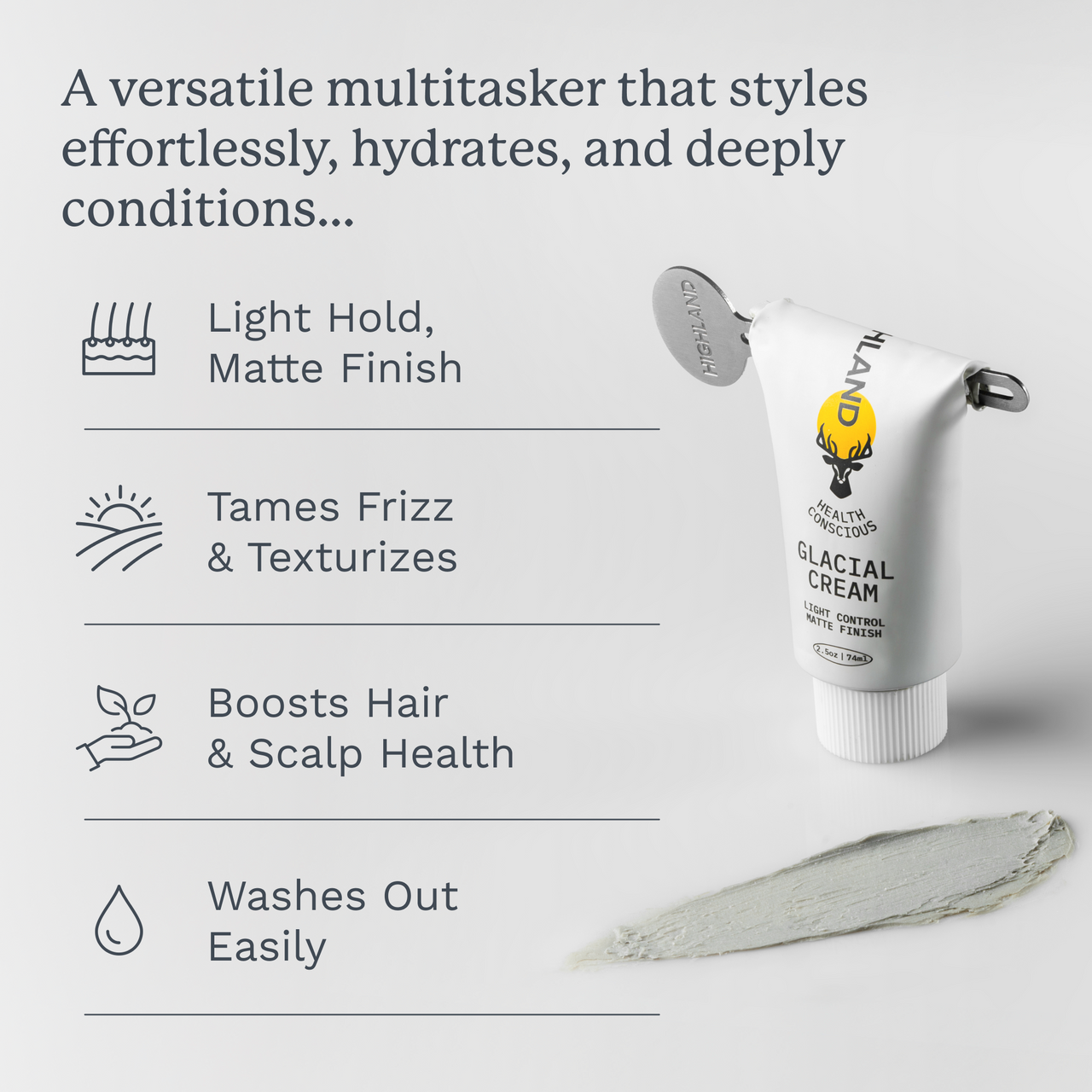 Our Glacial Cream is a versatile multitasker that deeply conditions and tames frizz while enhancing your hair's natural texture. Developed for hydration and smooth styling, our natural, science-backed formula helps you to effortlessly achieve happier hair.