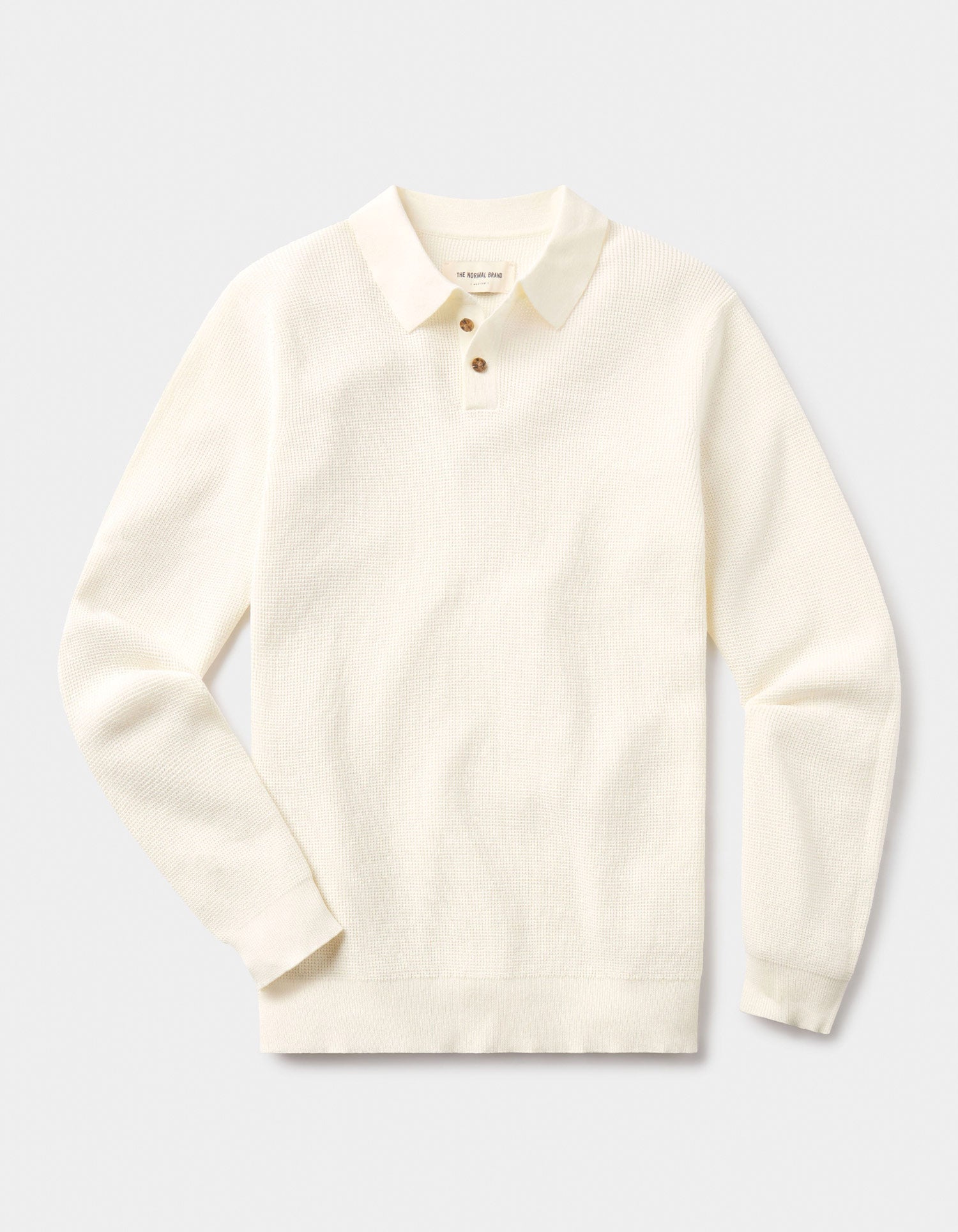The Robles Knit Waffle Stitch Polo is lightweight, true-to-size, and made from 100% our Cotton Robles yarn—soft with a subtle stretch and classic cotton feel. It features an all-over waffle-inspired novelty stitch, and is finished with contrast rib details at the collar, button placket, sleeve cuffs, and bottom band. Inset sleeves and marled buttons round out this elevated take on a casual essential.