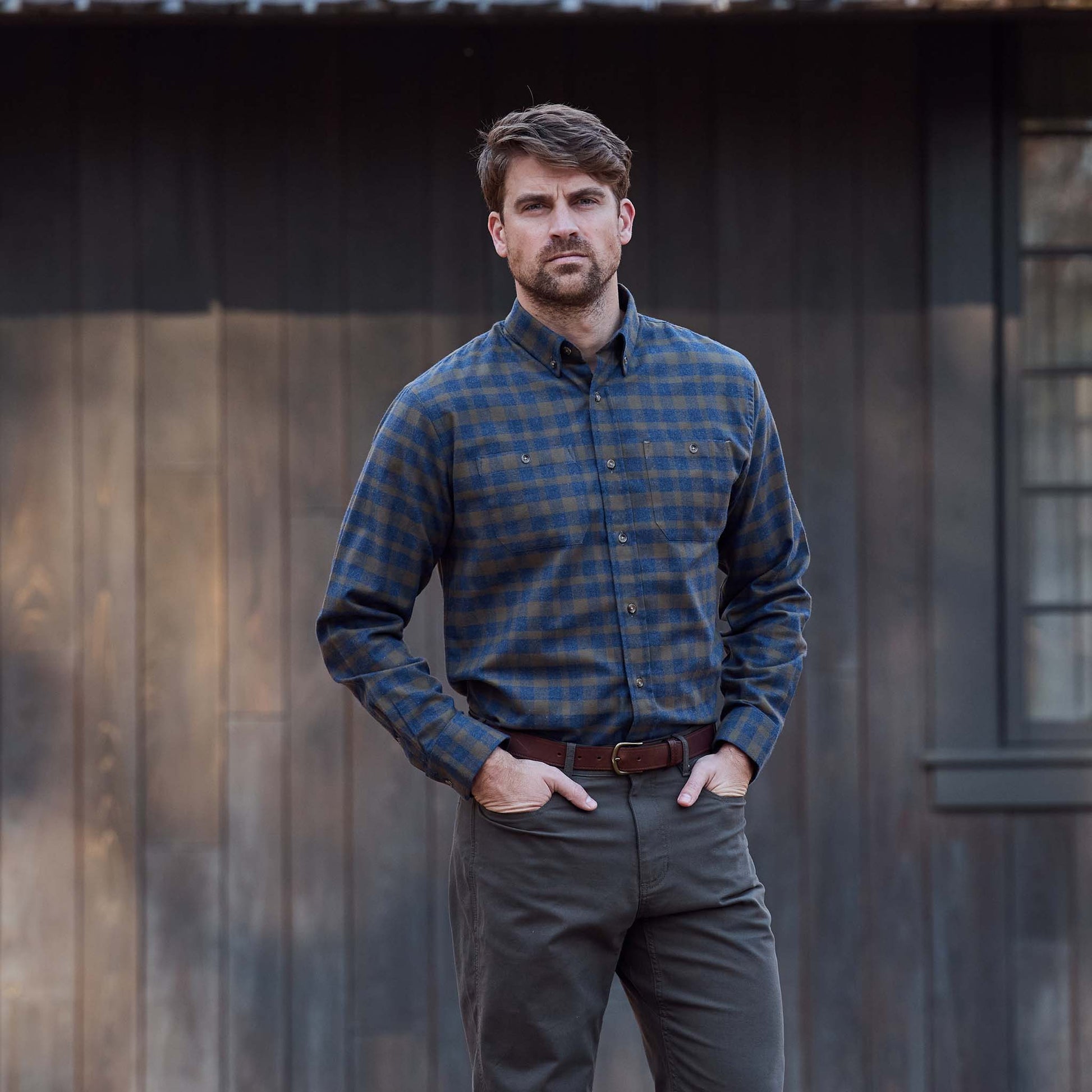 Our Brushed Cotton Twill Shirt is a refined, medium-weight shirt perfect for cool autumn and winter days outside. Constructed from an ultrasoft, 4.9oz cotton fabric, this shirt has a classic fit for comfortable wear in the field, at the lodge, and around town. Outfitted with a button-down collar, adjustable cuffs, and two buttoned chest pockets, the Brushed Cotton Twill Shirt includes a nod to our roots: a contrast bottom button hole inspired by Alabama red clay. Durable urea buttons. 100% cotton. Machine wash warm.