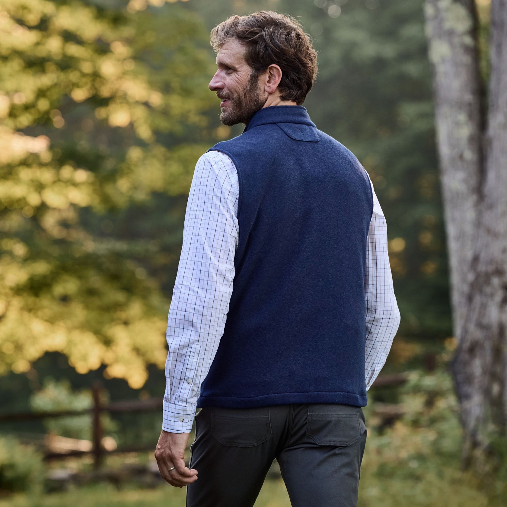 The Warren Fleece Vest combines the natural performance of wool with the easy care of synthetic materials. The result is a warm layer with a refined, classic look. The soft, low-bulk synthetic knitted fabric has four-way stretch and thermal insulation, and is moisture-wicking to keep you comfortable in any weather. A short standing collar and an adjustable drawcord along the hem help insulate you from the cold. This men’s fleece vest has a zip front closure and three zippered pockets, one on the left chest and two handwarmer pockets lined with a brushed tricot. The Warren is complete with a nod to Tom Beckbe's heritage: contrast back piping inspired by Alabama red clay.
